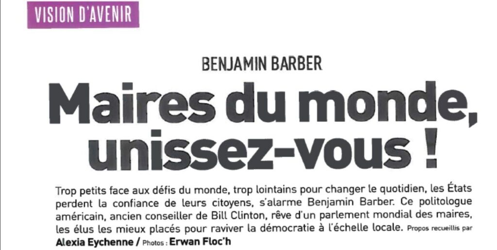 American political theorist Benjamin Barber mentions Efus among international networks which allow mayors to collaborate, Socialter, August 2015. Access reserved for members