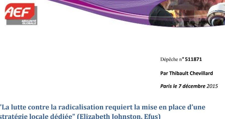 Entretien avec Elizabeth Johnston, déléguée générale de l’Efus, sur la promotion des stratégies locales face à la radicalisation, AEF, décembre 2014. Article réservé aux membres.