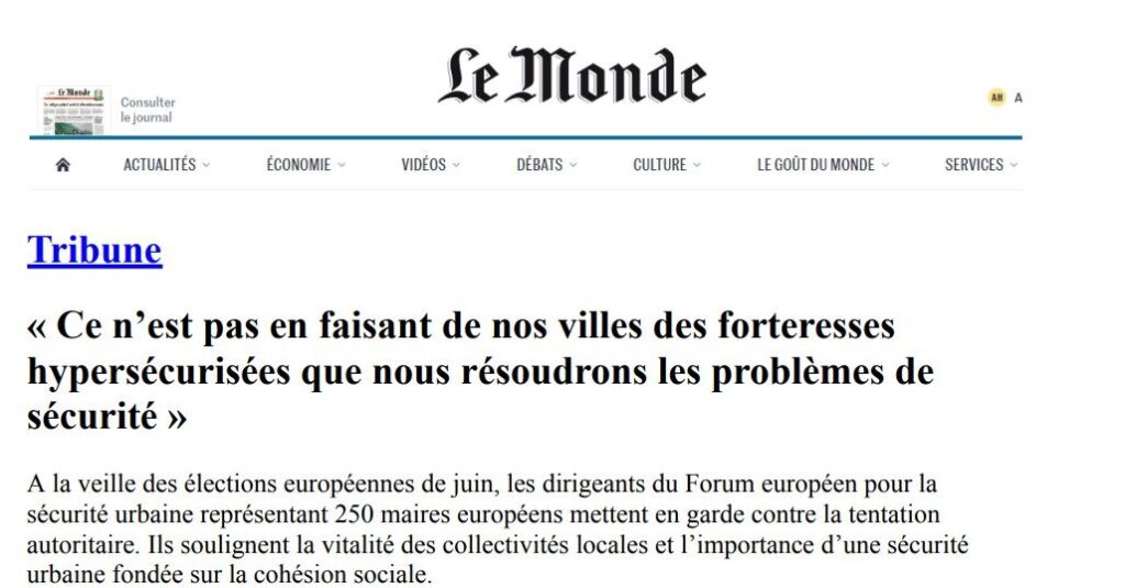 Le comité exécutif de l’Efus met en garde contre l’autoritarisme avant les élections européennes de 2024, Le Monde, mars 2024. Article réservé aux membres