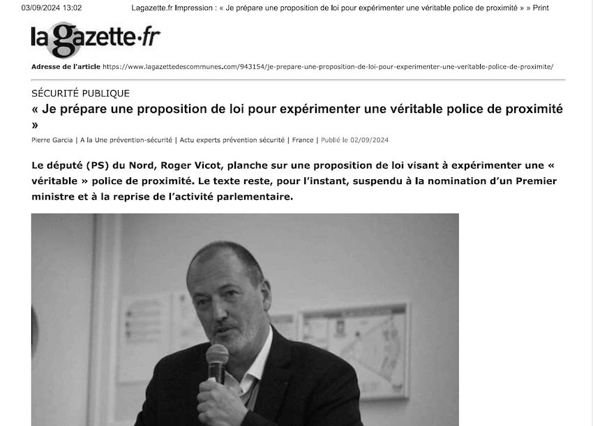 Le député du Nord Roger Vicot, ancien président du Forum Français pour la Sécurité Urbaine, appelle à une « véritable police de proximité », La Gazette des communes, septembre 2024. Article réservé aux membres
